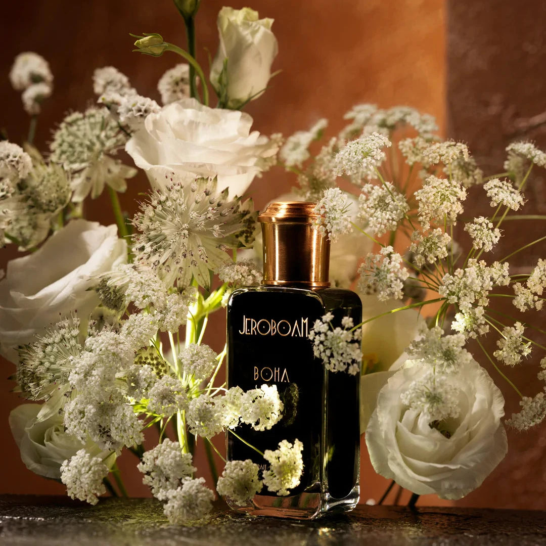 Mood: Clean Skin Scents / Statement Makers. Jeroboam's Boha is an opulent Extrait de Parfum constructed around a white floral bouquet that evokes an almost intimidating purity. It perfectly captures the Clean Skin Scents mood while simultaneously acting as a Statement Maker designed to be worn like a provocation—subtle, delicate, yet profoundly moving, leaving an indelible trail.